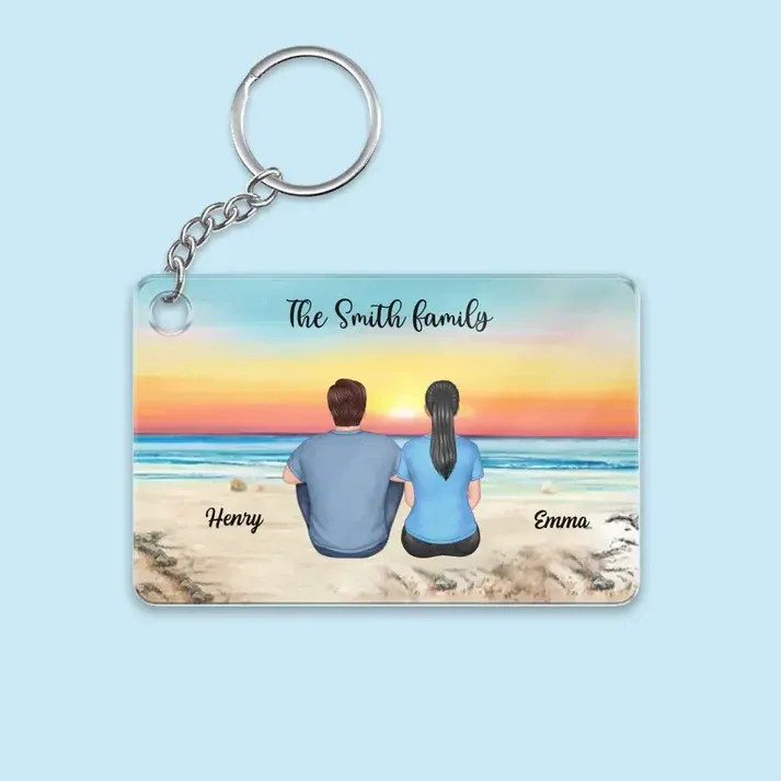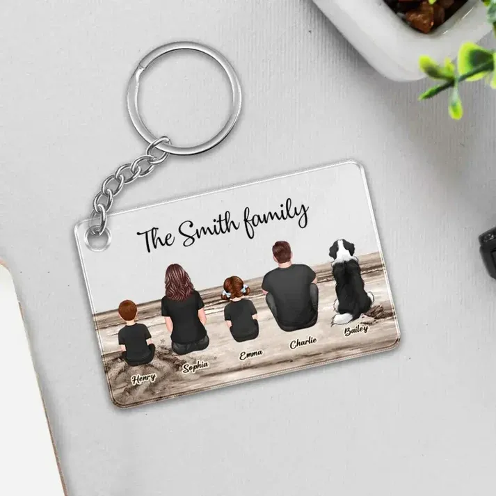 Family Sitting Back View Retro Vintage Beach Landscape Acrylic Keychain